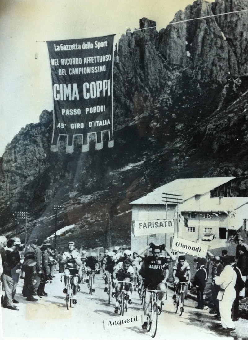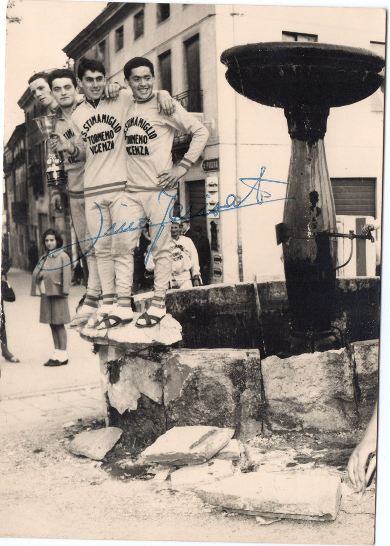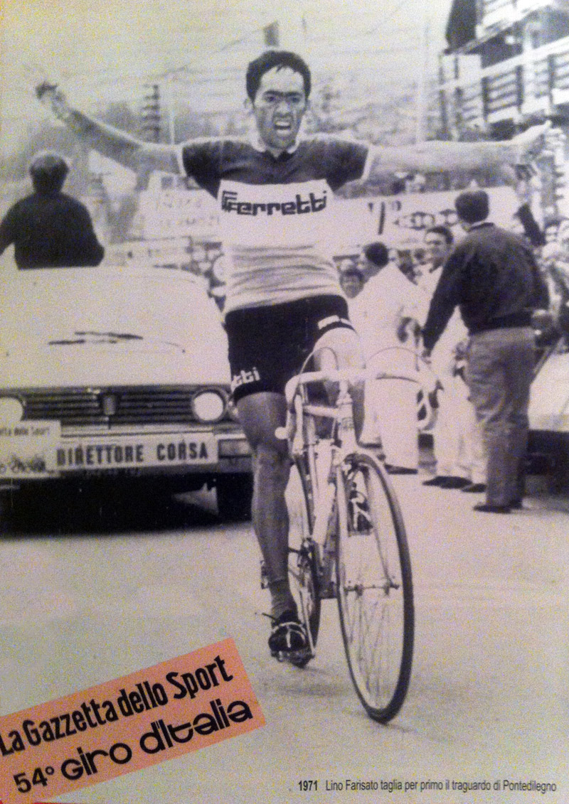 “In viale della Vittoria arrivò da solo, a braccia alzate. Pochi chilometri dopo il via da Cortina era entrato in una fuga di un manipolo di uomini che comprendeva Polidori, Taccone e il tedesco Rudi Altig. Sulle rampe sterrate del Nevegal se li era scrollati di dosso, percorrendo gli ultimi 80 chilometri in solitudine scalando il Cansiglio. Poi fino a Vittorio Veneto scese a velocità pazzesca, toccando nei tratti di rettilineo i 100 chilometri all’ora. Eppure avrebbe dovuto essere un po’ più prudente visto quanto gli era capitato pochi giorni prima del Giro alla “Settimana Catalana”. Durante una cronometro era finito sotto un camion che gli aveva improvvisamente tagliato la strada. Di fronte agli spettatori che si erano messi le mani nei capelli, lui sbucò da sotto il camion miracolosamente illeso. La bici non c’era più, letteralmente frantumata dalle ruote. Ancora oggi a Farisato vengono i brividi quando ricorda quell’episodio agli amici.